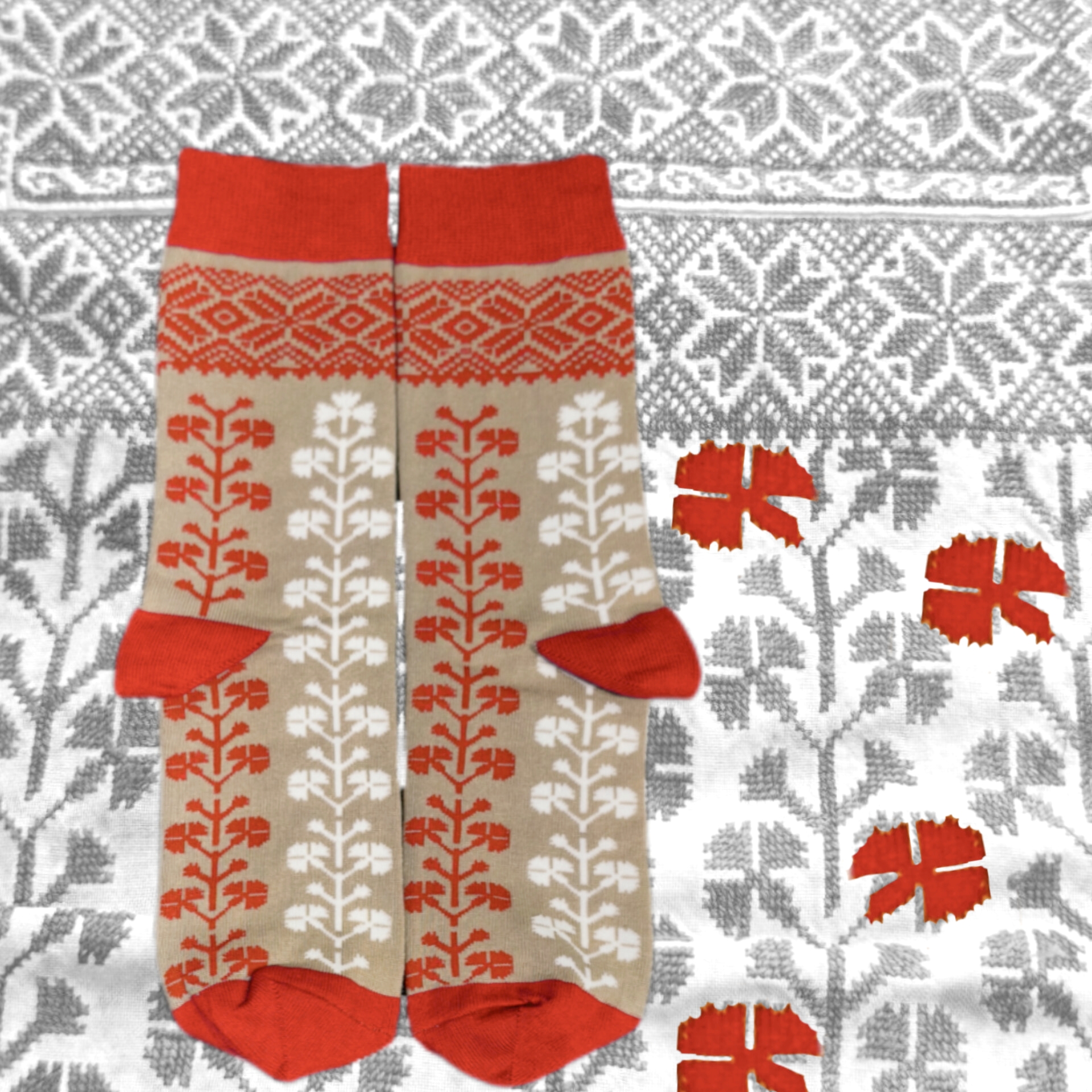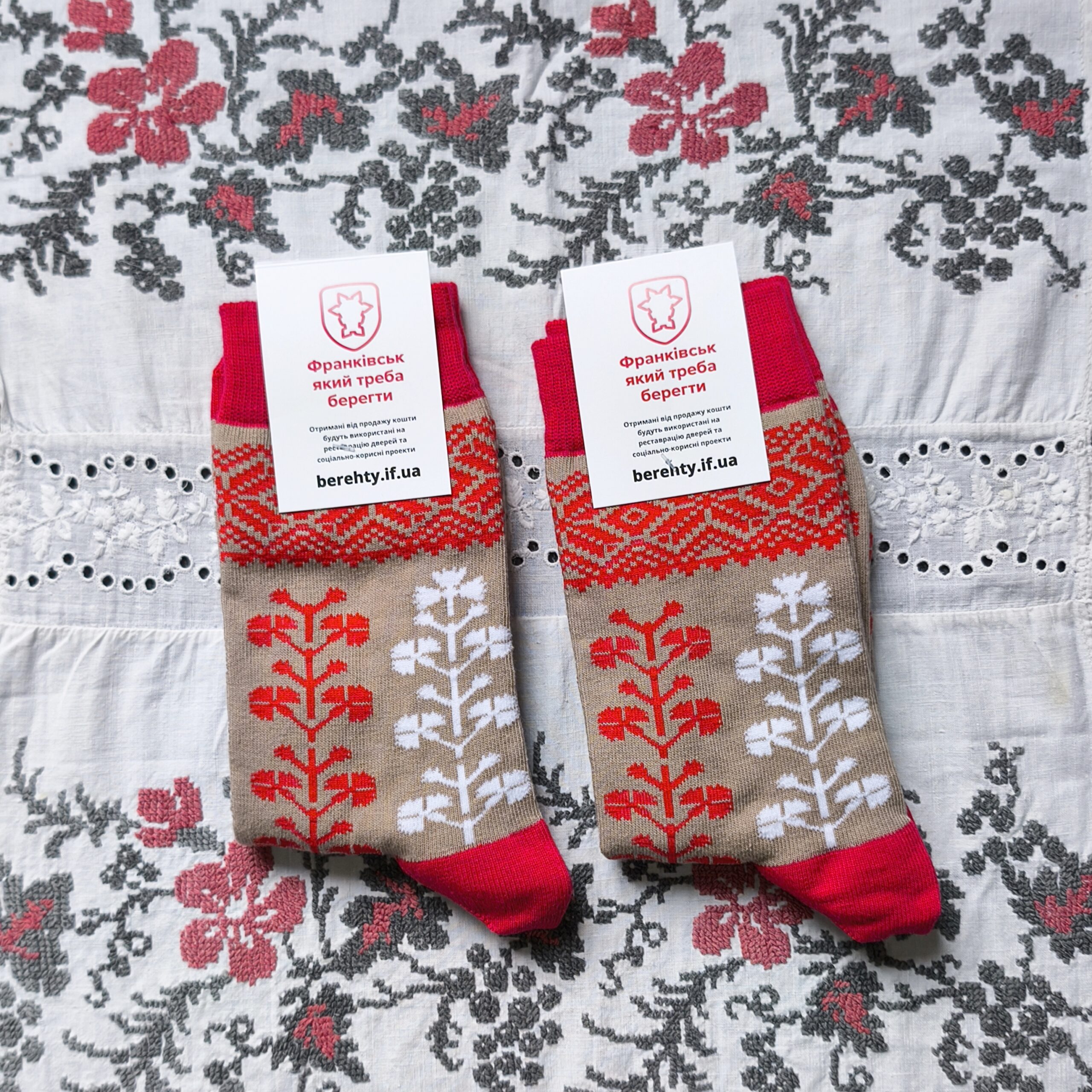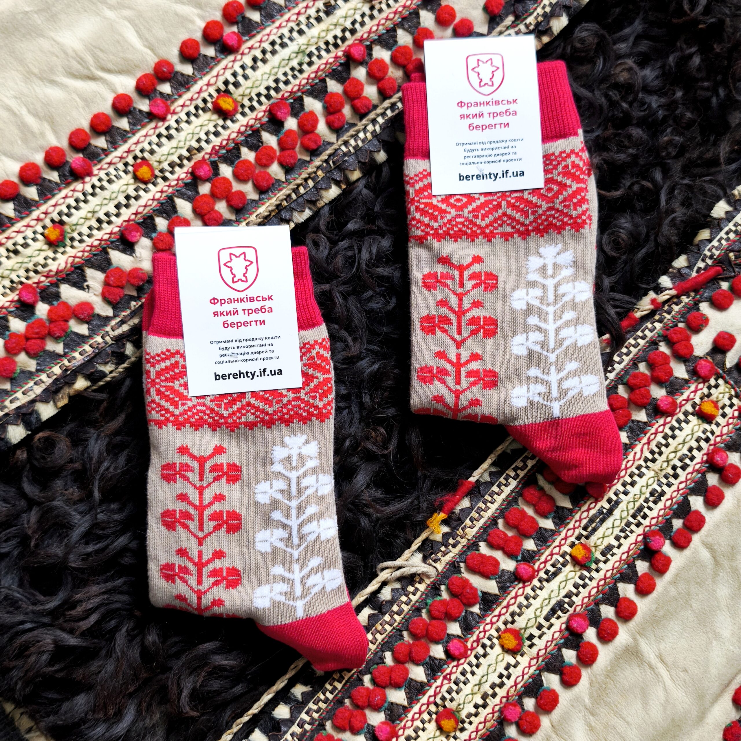 В дизайні шкарпеток використано візерунок сорочки з Снятинського району Івано-Франківської області, яка зберігається у фондах Національного музею Гуцульщини та Покуття (м.Коломия)